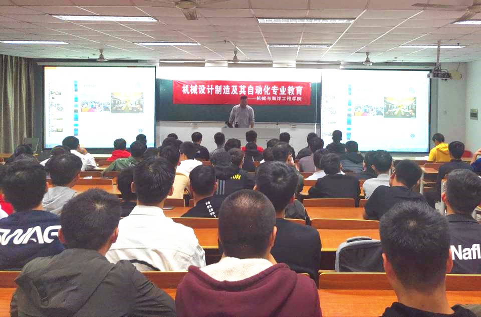 为更好的帮助新生明确学习目的,端正学习态度,开阔专业视野,同时合理规划老员工活,明确就业发展方向,顺利完成从中学到大学的角色适应和转变。10月24日晚7时,机械与海洋工程公司2019级机械设计制造及其自动化专业教育讲座在通灌校区至善楼305教室举行。机械与海洋工程公司副经理贺毅强教授、机械系主任丁云飞副教授,船舶系邹昶方博士应邀参加并为2019级机械专业本科生作专业教育介绍。2019级机械设计制造及其自动化专业全体新生参加本次讲座。