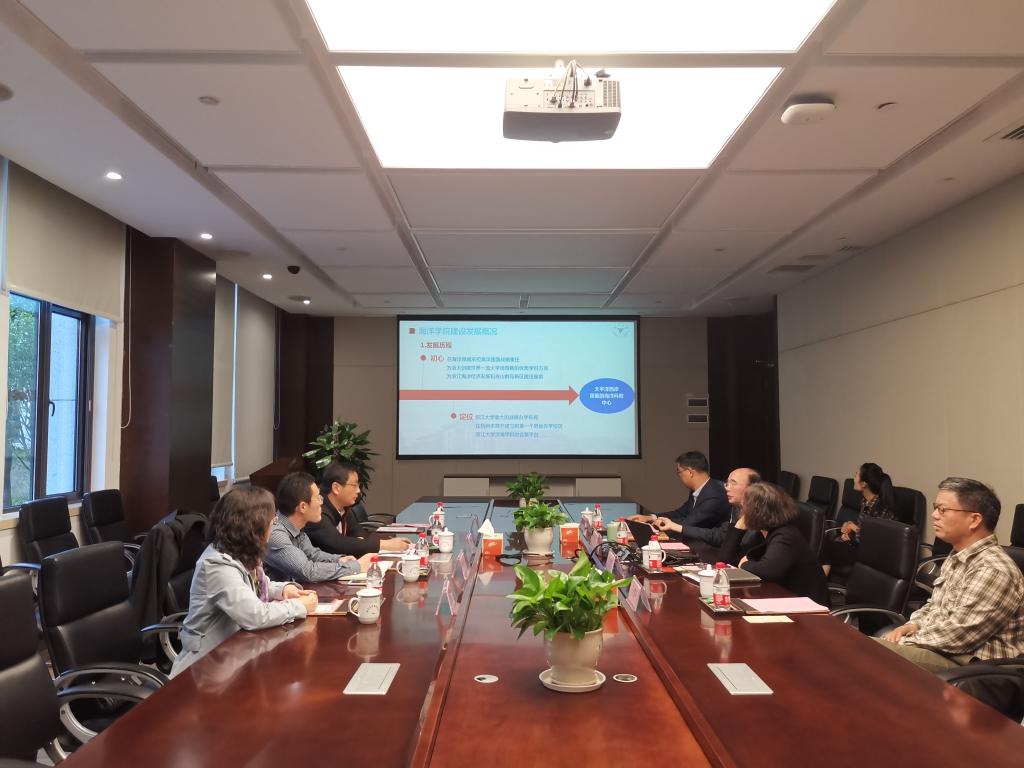 在浙江大学海洋公司调研期间,就“机器人工程专业”与“船舶与海洋工程专业”的建设和发展、党组织建设以及“不忘初心、牢记使命”主题教育等方面开展了深入的交流,参观考察了校区和大型实验设备群。浙大海洋公司在舟山校区建设了“三池(消声水池、波流水池、操纵性水池)、六槽(推移质水槽、U型折叠式水槽、大型断面实验水槽、环形水槽、精密玻璃实验水槽、旋转水槽)、一筒(60MPa压力筒)、一台(双六自由度仿真实验平台)”等具有国际一流水准、能满足多种海洋试验需求的大型实验设施群;在定海摘箬山岛,建设有国内第一个海洋科技示范岛。现有海洋工程装备国家地方联合工程实验室和海洋岩土工程与材料浙江省重点实验室、海洋观测-成像试验区浙江省重点实验室、海洋装备试验浙江省工程实验室、海洋工程材料浙江省工程实验室、海上试验浙江省科技创新服务平台以及浙江省“智慧东海”协同创新中心等科研平台。
