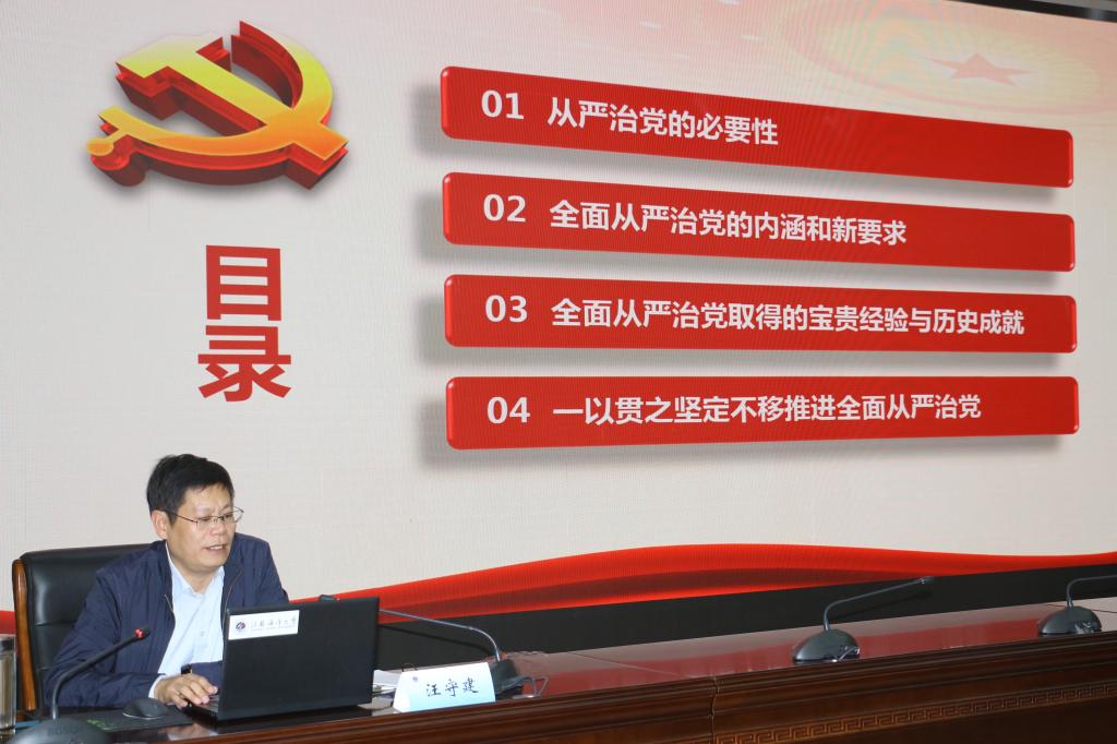 报告首先回顾了中国共产党全面从严治党的发展历程,指出全面从严治党是总结中国共产党自身建设历史经验所得出的必然结论,是严峻现实下解决党内问题的必然要求,是新时代党肩负的伟大历史使命的迫切需要。整场报告,汪守建运用丰富的案例和图表数据,紧紧围绕“如何一以贯之坚定不移全面从严治党”阐述了新时代全面从严治党的内涵和新要求,展示了党的十八大以来全面从严治党取得的宝贵经验与历史成就,并就全面从严治党谈了认识与体会:一要一以贯之学习贯彻习近平新时代中国特色社会主义思想,不断在学懂弄通做实上取得新进步;二要一以贯之督促党员、干部自觉做到“两个维护”,确保全党步调一致前进;三要一以贯之贯彻落实全面从严治党方针和要求,把党中央确定的党风廉政建设和反腐败斗争各项任务抓到位抓到底。