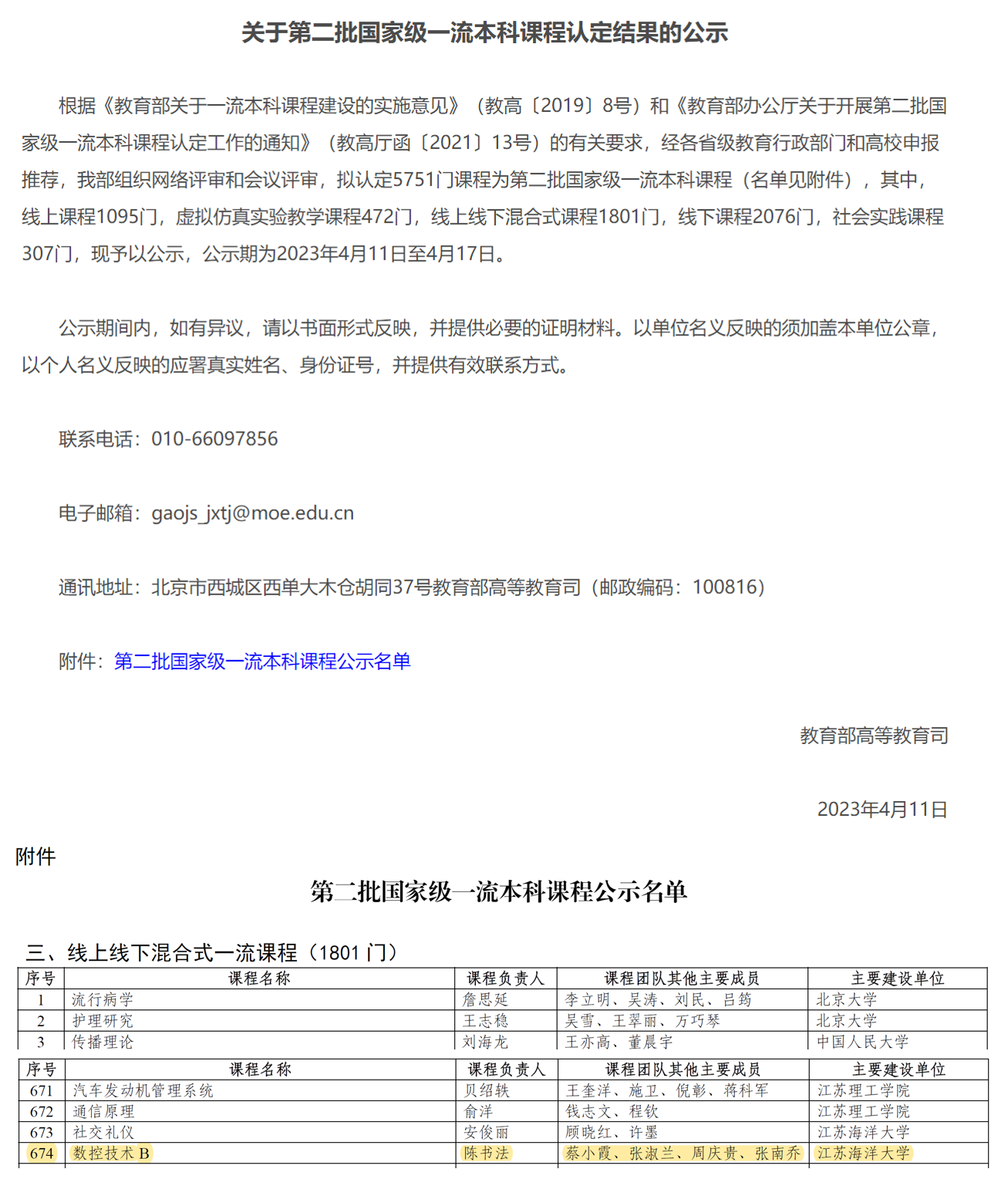 日前,教育部高等教育司公布了“第二批国家级一流本科课程公示名单”,公司《数控技术B》成功获批国家级一流课程(线上线下混合式)。