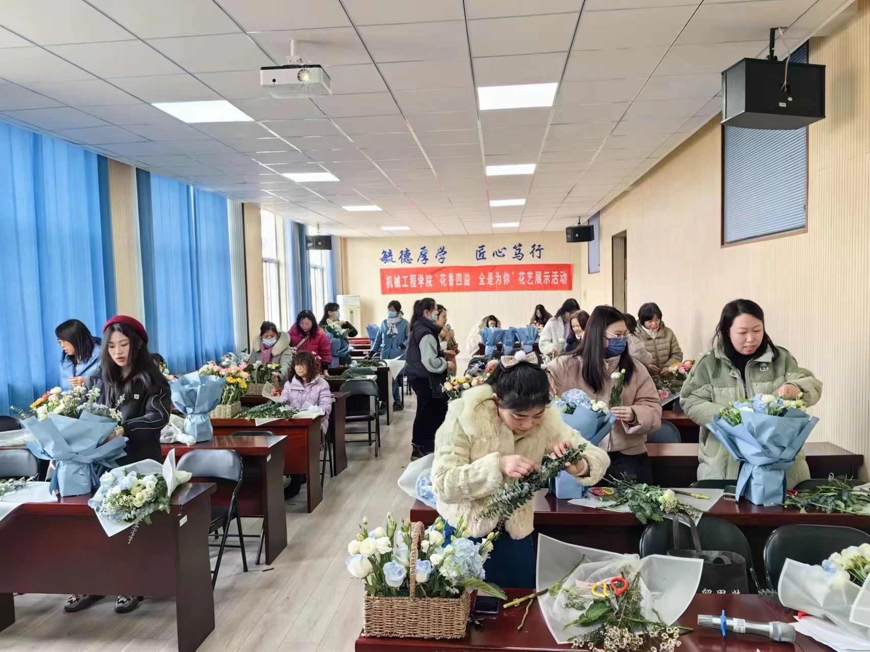 活动期间,机械楼N210会议室繁花似锦,春意盎然,玫瑰花明艳、康乃馨馥郁、绣球花锦簇、百合花冰清。公司特别邀请的花艺师现场讲解花卉知识,手把手教授插花技艺,为大家带来了一场别开生面的视觉盛宴。她们详细地介绍了各种花材的名称、特点和花语,并通过娴熟的技巧进行剪裁示范和插花表演。公司女老师创意频出、巧手翻飞,美丽的鲜花仿佛被赋予了生命,一件件精美的花艺作品创意百出。