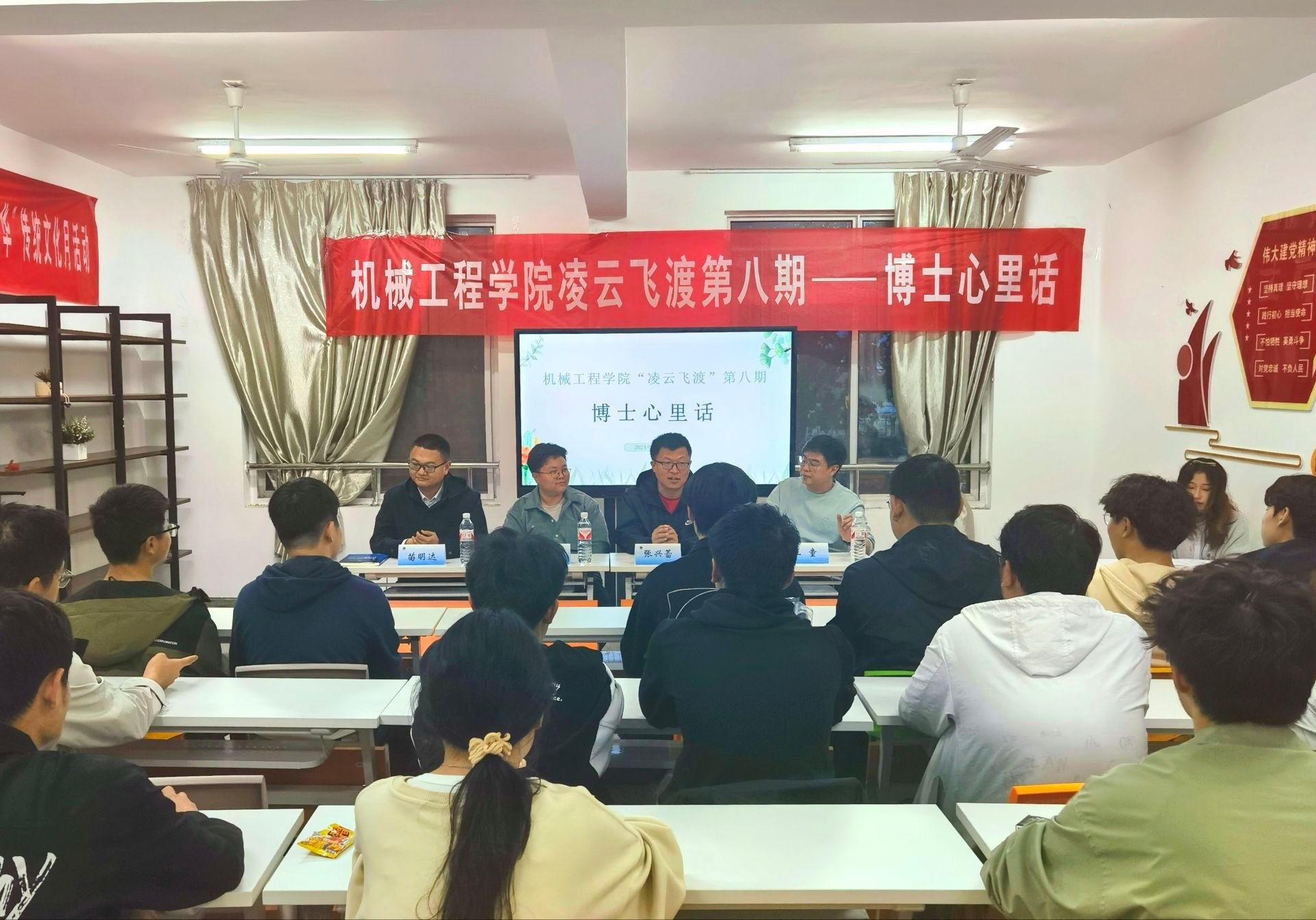 为帮助青年老员工明确人生规划,树立远大理想,汲取宝贵学术经验,4月29日晚,伟德国际bevictor1946在苍梧校区“一站式”员工社区A7/A8-205举办“凌云飞渡”系列访谈活动第八期——博士心里话。青年博士张兴蕾、王童、薛浩和苗明达受邀出席,就青年老员工密切关注的热点问题进行面对面交流,来自公司各年级近50名同学参加活动。