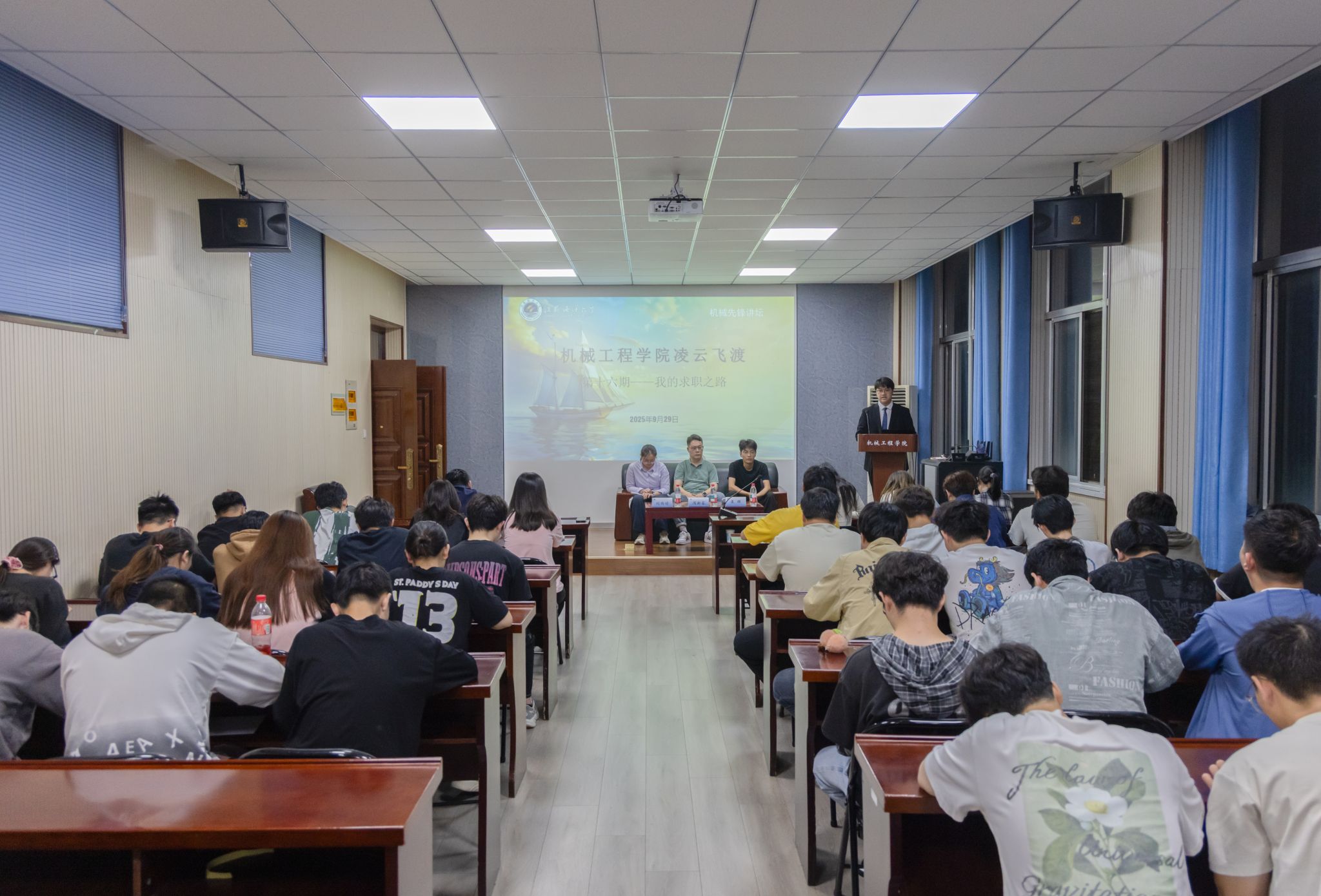 9月29日晚,伟德国际bevictor1946在机械楼N210举办第十六期“凌云飞渡”访谈活动暨机械先锋讲坛——我的求职之路。本期活动特邀来自中国人民财产保险股份有限公司连云港市分公司的崔醒、东方国际集装箱(连云港)有限公司的周新睿和日出东方控股股份有限公司的刘雨婷三位员工担任主讲嘉宾。